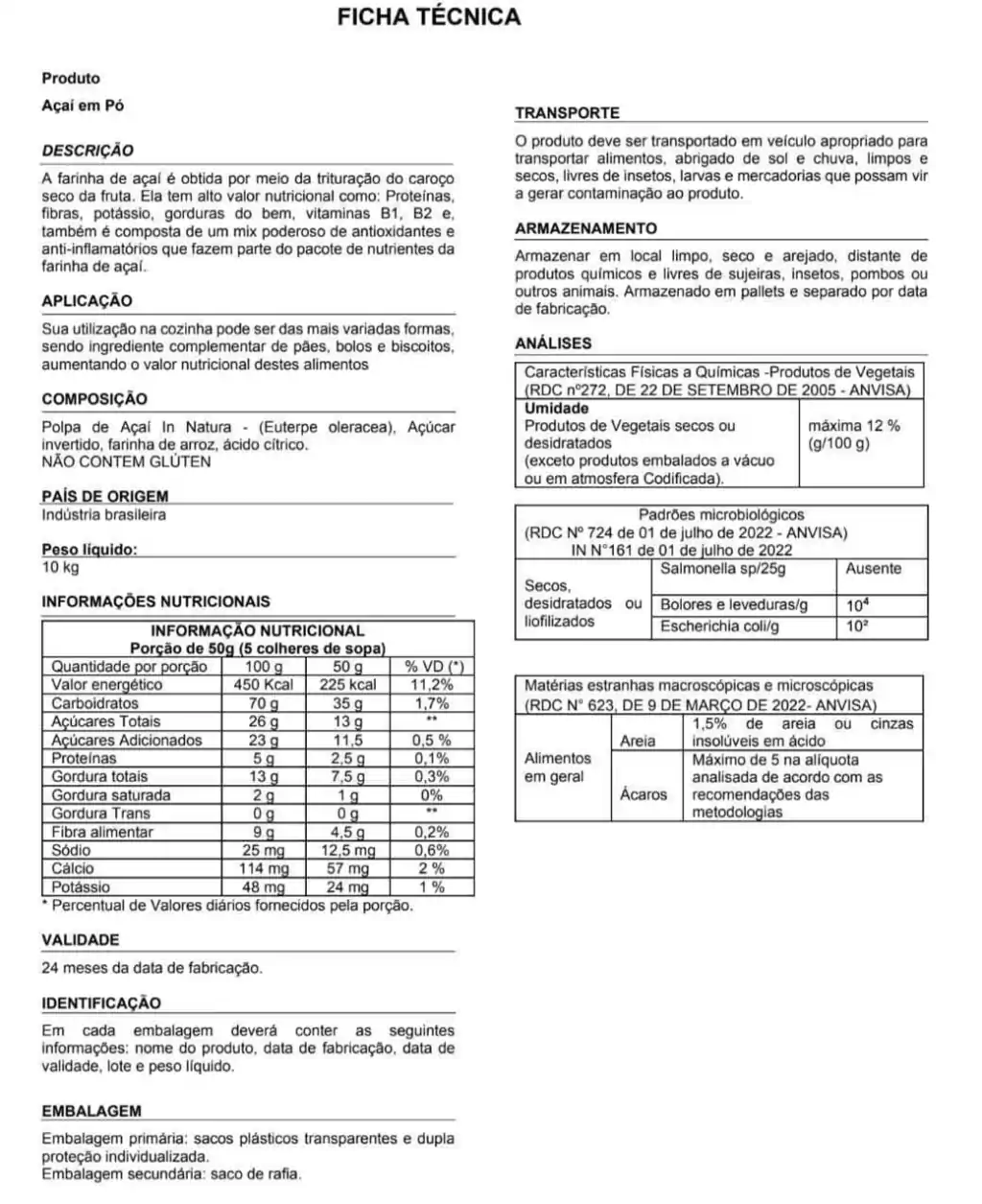 A farinha de açaí é obtida por meio da trituração do caroço seco da fruta. Ela tem alto valor nutricional como: Proteínas, fibras, potássio, gorduras do bem, vitaminas B1, B2 e, também é composta de um mix poderoso de antioxidantes e anti-inflamatórios que fazem parte do pacote de nutrientes da farinha de açaí.