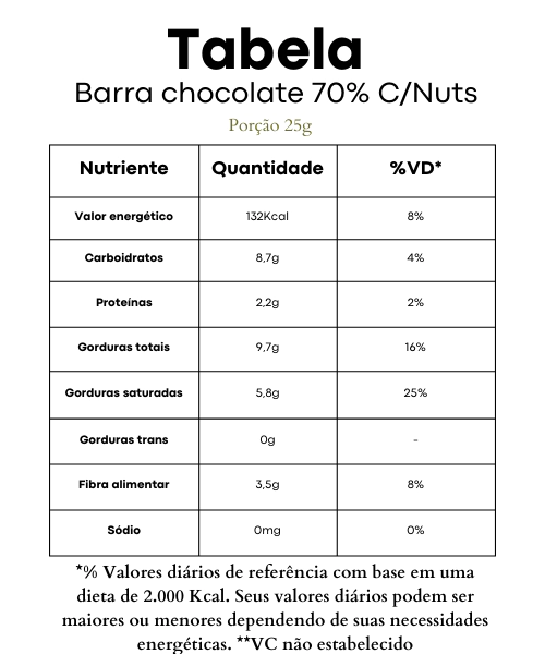Barra de chocolate é simplesmente uma delícia, ela vai nos deixar aquele gostinho de quero muito mais, com uma pitadinha de nuts, torna muito mais prazeroso e aquela vontade que não querer para de comer, simplismente uma experiência inesquecível. Fabricada é de em Paraná, ela é produzida de forma quase artesanalmente e com ingredientes selecionados e inspecionados, mantendo um alto padrão de qualidade, um verdadeiro show visual e um sabor invejável e equilibrado.