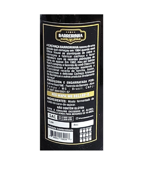 A cachaça Barreirinha Ouro é produzida na fazenda Barreirinha na cidade de Abre Campo e conservada em tonéis de UBURANA e CARVALHO, envelhecida a cachaça, ela deixa uma tonalidade dourada e mais muito mais apreciada pelos amantes desta bebida.