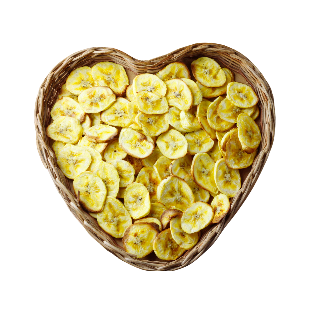 As lascas de banana são secas, em fatias crocantes de bananas. Elas são temperadas com sal rosa do himalaia, salsa e cebola, deixando ainda muito mais saborosa e é rica em fibras, não possuem conservantes, é natural, sem glúten, sem Colesterol, 0% gordura trans e é um produto Vegano.