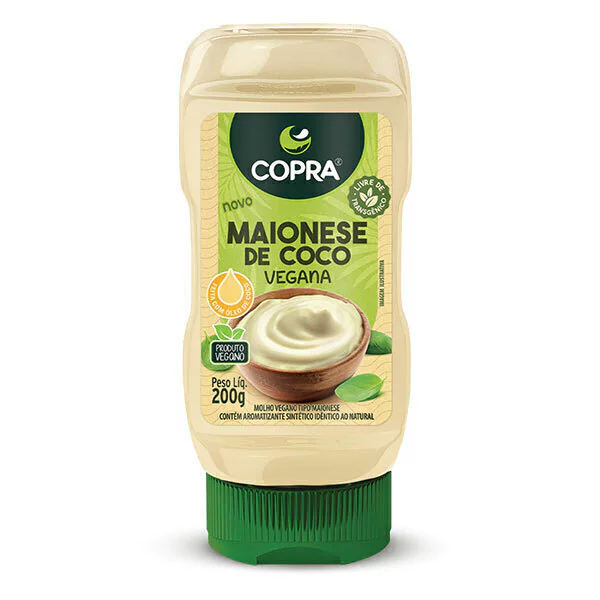 A Maionese de Coco Vegana Copra não contém leite, ovo, lactose, glúten, gordura trans, também é livre de alergênicos, sendo a escolha perfeita para quem busca qualidade de vida e sabor na mesma receita. Leve e saborosa para as refeições, lanches e receitas. É feita a base de 100% óleo de coco, substitui a maionese tradicional. Após aberta, conservar em geladeira e consumir em até 15 dias. Voltado para os consumidores veganos que desejam degustar produto saboroso – que desejam ingerir alimentos mais naturais sem gorduras trans feita com óleo de coco.