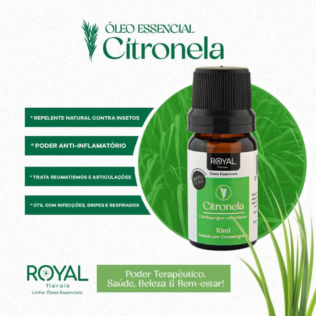 O óleo essencial de citronela é um repelente natural contra insetos e tem poder anti-inflamatório, além de ajudar no tratamento de dores nas articulações e reumatismo, ele também é muito útil no tratamento de infecções, gripes e resfriados.