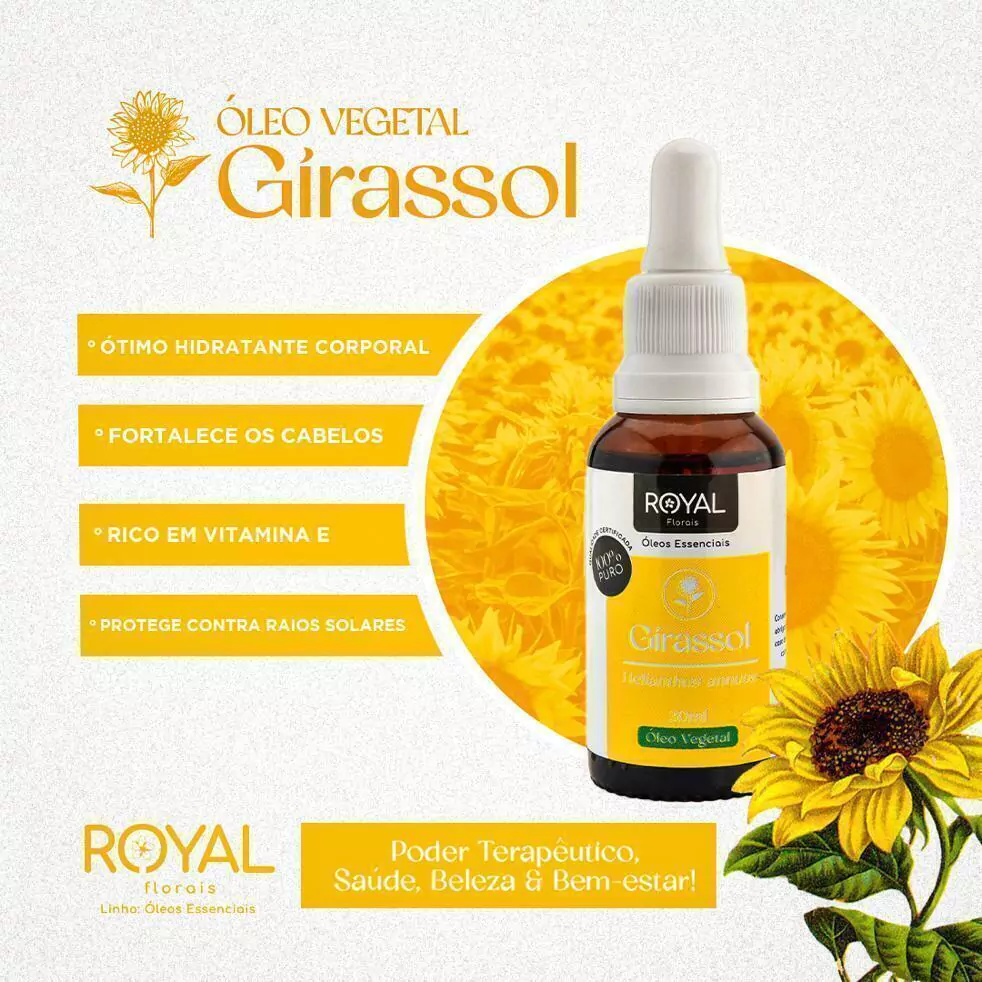 O óleo vegetal de Girassol é ótimo com hidratante corporal, atua como fortalecimento dos cabelos, é rico em vitamina C e protege com os raios solares.