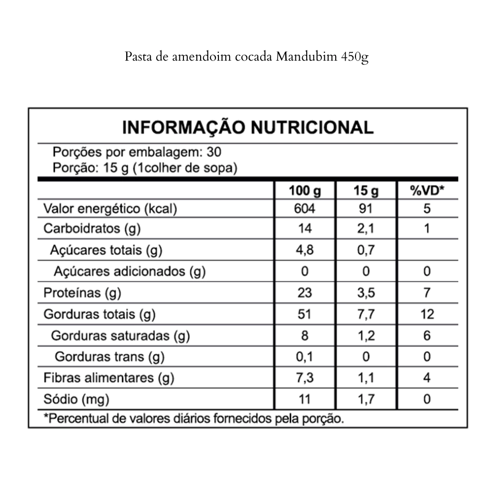 A pasta de amendoim com cocada Mandubim de 450g é um produto que combina o sabor do amendoim com a doçura do coco. Aqui estão algumas informações relevantes sobre esse produto: