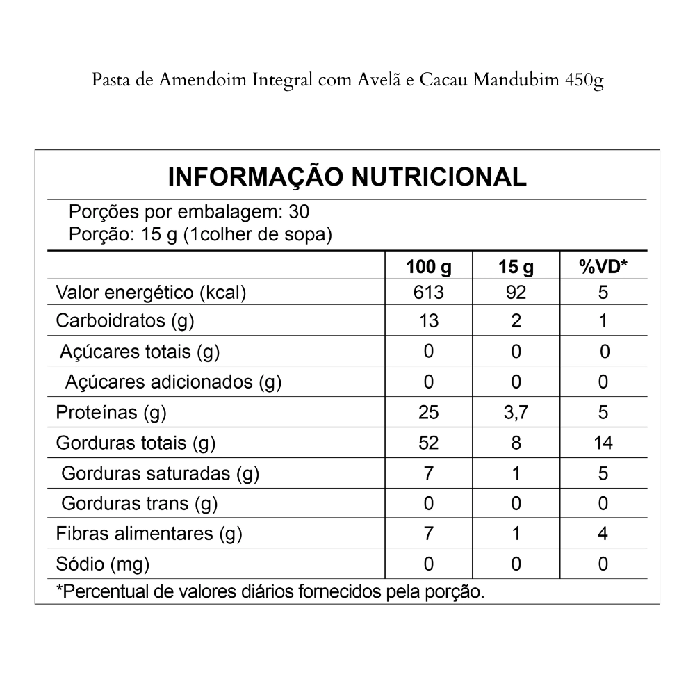 A Pasta de Amendoim Integral com Avelã e Cacau Mandubim 450g é uma deliciosa e nutritiva combinação que une os benefícios do amendoim integral com o sabor irresistível da avelã e do cacau.