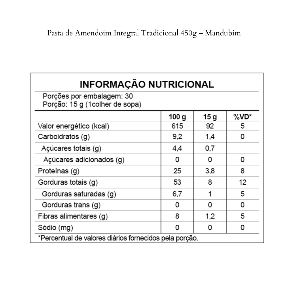A Pasta de Amendoim Integral Tradicional Mandubim 450g é um produto feito com apenas um ingrediente: amendoim torrado e moído. Por ser integral, ela mantém todas as propriedades naturais do amendoim, sendo uma fonte de proteínas, fibras, vitaminas (como a E e do complexo B), minerais (como selênio) e gorduras saudáveis (ômega-3 e ômega-6).