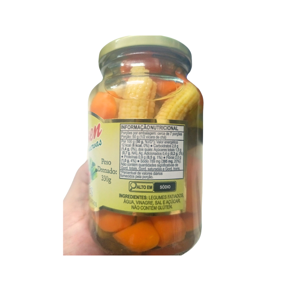 Ingredientes: Picles, couve-flor, pepino, cenoura, milho, água, vinagre, sal e açúcar.