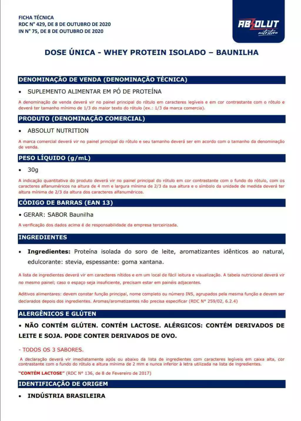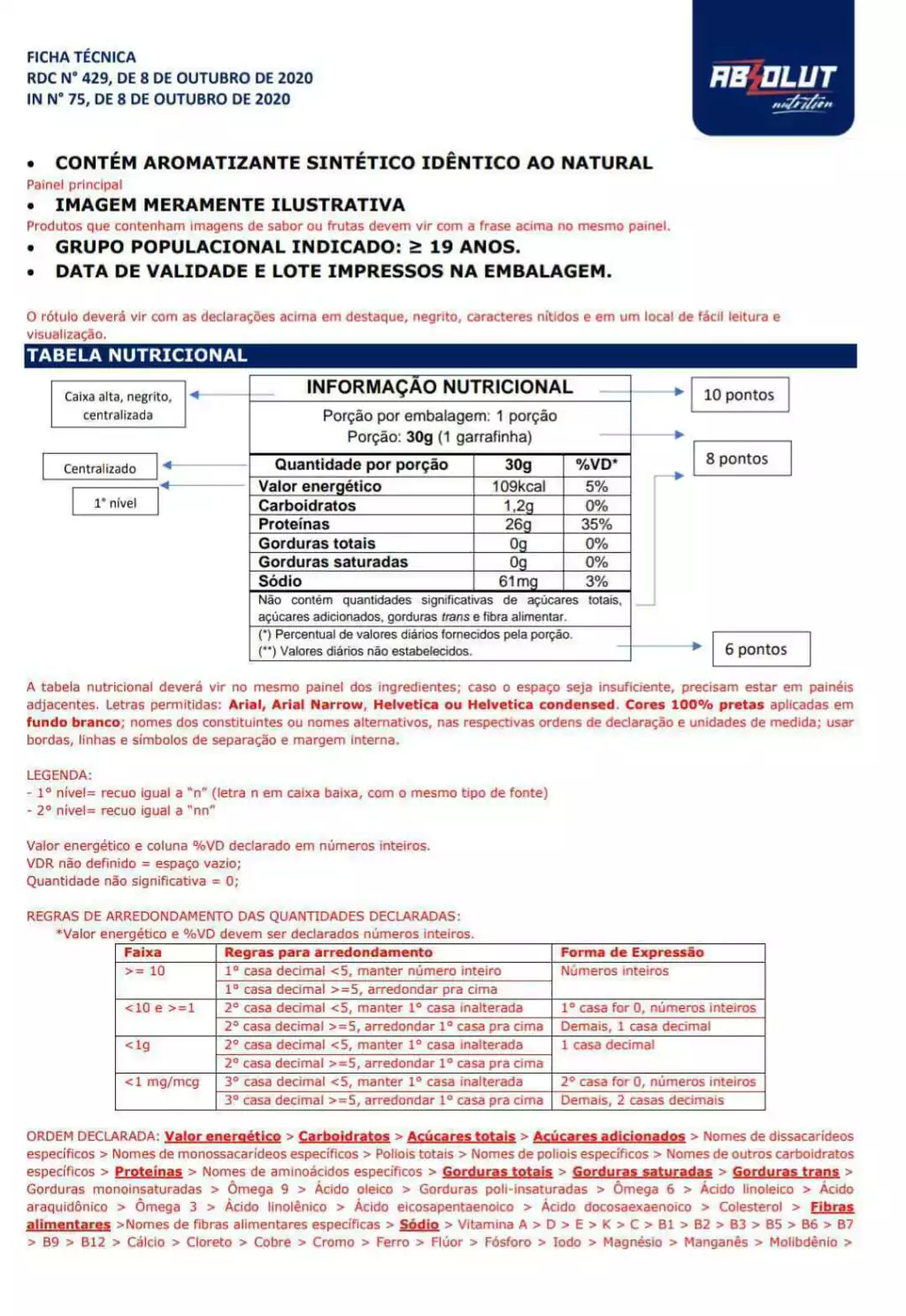 O whey protein isolado da Absolut Nutrition utiliza em sua composição uma proteína pura e natural, derivada da mais alta qualidade do soro de leite. É seca por atomização a baixas temperaturas para preservar as propriedades naturais da proteína original. Sua pureza lhe confere um sabor mais leve, limpo e livre de gorduras. A saborização, coloração e estabilização seguem uma tendência mais natural e a saudabilidade. 27g proteína 5,8g bcaa’s 4,5g glutamina Zero adição de açucares Zero gordura